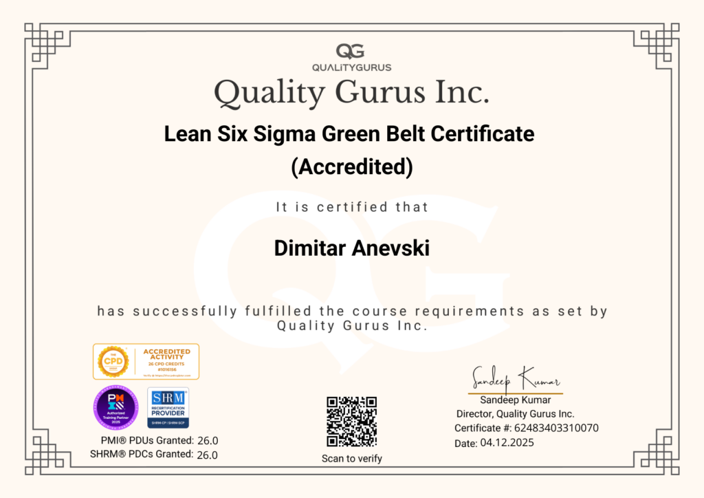 Anevski Partners is a certified training and consulting firm specialized in Six Sigma Green Belt programs. We help professionals and companies initiate, complete training, achieve certification, and successfully apply Six Sigma methodologies with practical, results-oriented solutions tailored to your needs.